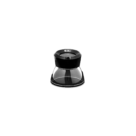 "Mullegruppernas" fältlupp för småkryp och annat, men fungerar givetvis utmärkt även för dia & negativbetraktning. Glasklar underdel med svart okular. Förstorar 8x, höjd 44 mm.