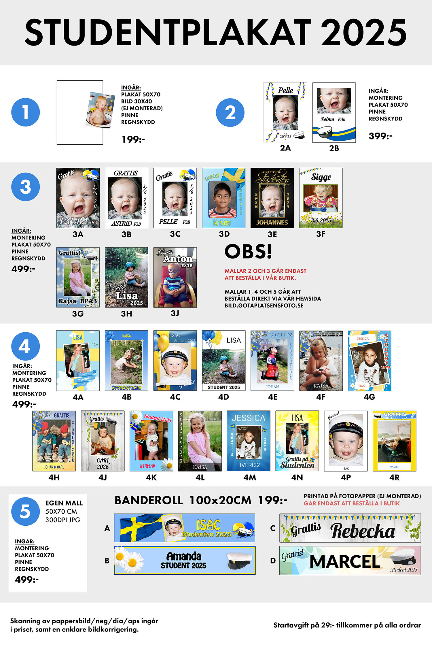 Vi har fem olika typer av studentskyltar i storlek 50x70, med flera olika mallar. Paketen har olika stora bilder framkallade på fotografiskt papper i högsta kvalité, i alla paket ingår pinne och regnskydd.