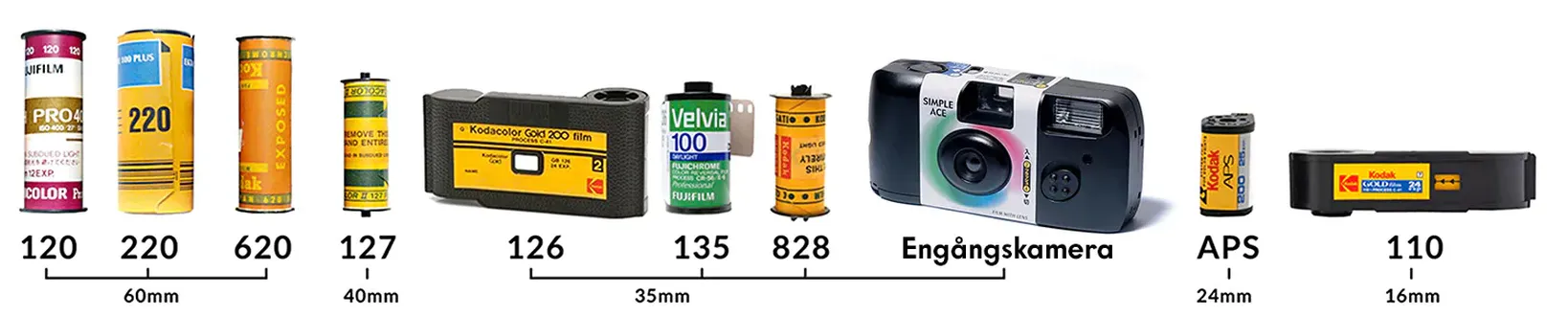 135-film, 120-film, 110-film, 126-film, DIA-film, svartvit film, engångskameror och APS-film (om din APS-film står på läge "1" så är den med största sannolikhet oexponerad, alltså inga bilder är tagna).