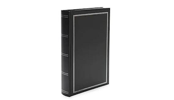 Bokbundet fotoalbum med fickor för 300 bilder i storlekar upp till 10x15 cm. Skrivfält bredvid varje bild. Svarta blad.