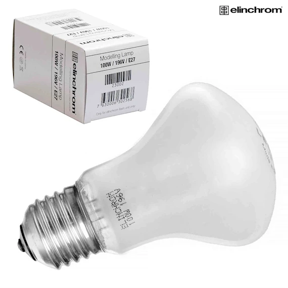 Elinchrom inställningslampa 100W/196V med sockel E27. Elinchromlampan, standard för alla mindre/äldre kompaktaggaregat, på grund av sin kryptonform täcks en del av blixtröret och man får ett något mjukare ljus. Blixtljuset och inställningsljuset överenstämmer bättre än de andra inställningslamporna.