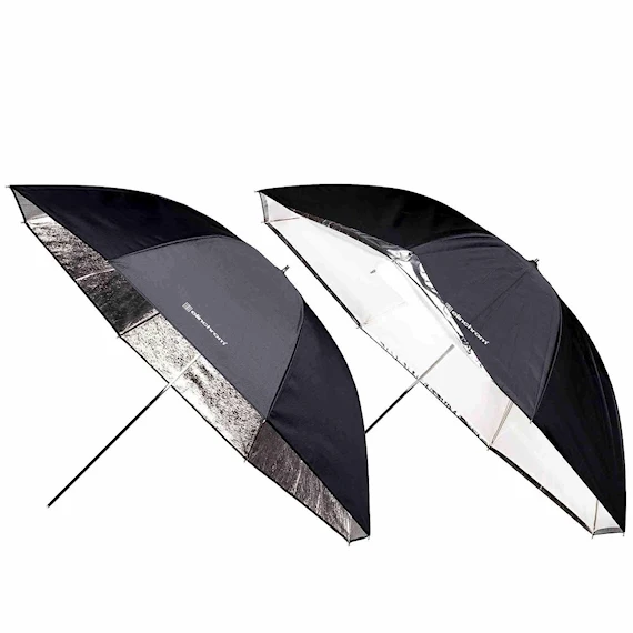 Elinchrom Silver Paraply 105 cm används för att studsa ljuset i och silverbeläggning ger ett riktat, hårt ljus. Mycket populärt för motiv där man vill framhäva struktur och ytmönster som t.ex. fotografering av konst eller tuffare porträtt.