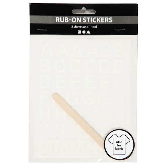Bokstäver som du överför till textilier, läder, papper och liknande. Motiven gnuggas över på föremålet med det medföljande redskapet. Tål mild handtvätt. Innehåller: 2 ark med vita bokstäver och 1 verktyg i trä.