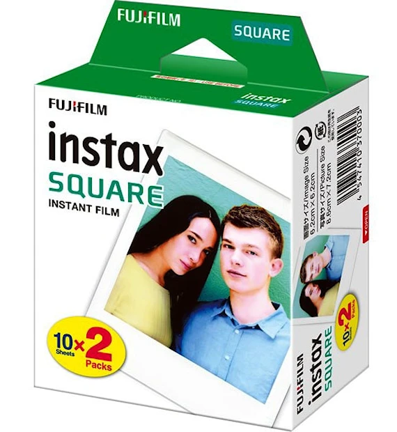 2x10st kvadratiska bilder till Instax Square-kameror. Varje bild har en vit ram och ett utrymme längst ner där man kan skriva någonting. Bildstorlek 62x62 mm.