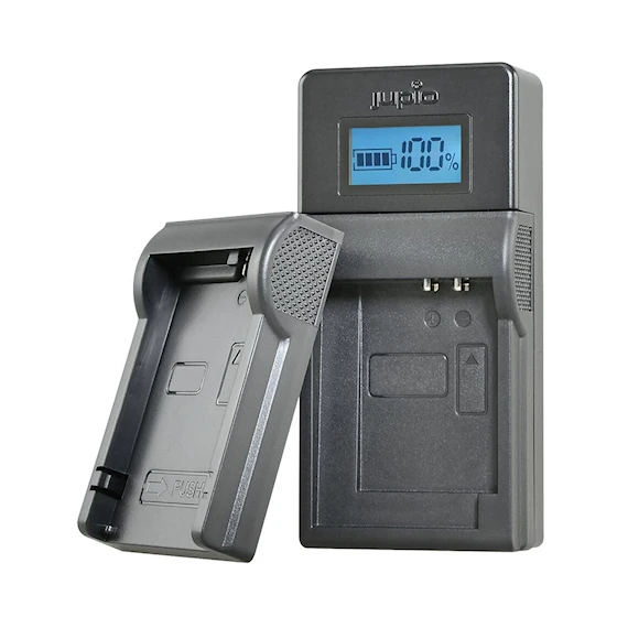 Universalladdare som passar de flesta Canon kamerabatterier som är mellan 7,2 och 8,4V. Batteriets laddningsstatus indikeras av en tydlig LCD. Det ingår flera olika plattor som är anpassade för olika batterier.
