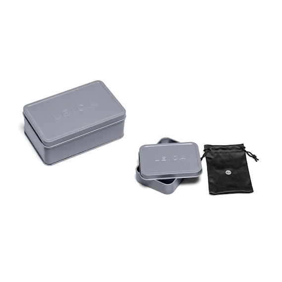 Setet inkluderar en större och en mindre plåtburk, båda präglade med en klassisk Leica-logotyp. För Instax Mini bilder