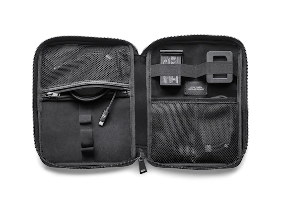 Den snygga svarta väskan håller ordning på alla små prylar du har med dig såsom batterier, sladdar och linsskydd. De elastiska remmarna på väskans insida gör det enkelt att fästa olika föremål säkert.