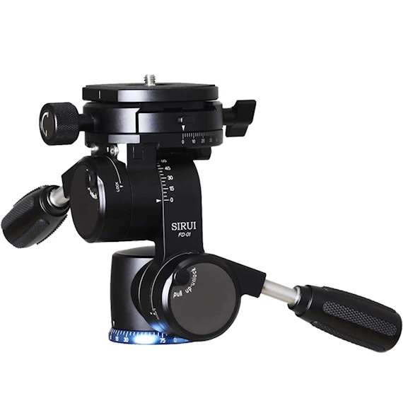 Det mångsidga fyrvägshuvudet Sirui FD-01 erbjuder fyra justerbara axlar för att kunna hantera varje tänkbar fotovinkel och har infällbara handtag för smidig transport och förvaring. Flera inbyggda vattenpass ger snabb och enkel nivellering av din kamera.