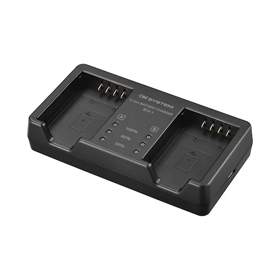 BCX-1 är den specialdesignade batteriladdaren för BLX-1. Den har förmågan att simultant ladda upp två batterier på ungefär 150 minuter. Laddaren är utrustad med en USB-C-port och kan matas med F-7AC, som följer med OM-1, eller genom valfri USB-C-nätadapter som levererar minst 27 watt eller 9V med 3A. Tack vare dess kompatibilitet med Power Delivery är det möjligt att använda en Power Delivery 3.0-kompatibel powerbank för att ladda batterierna när du är ute och rör dig.