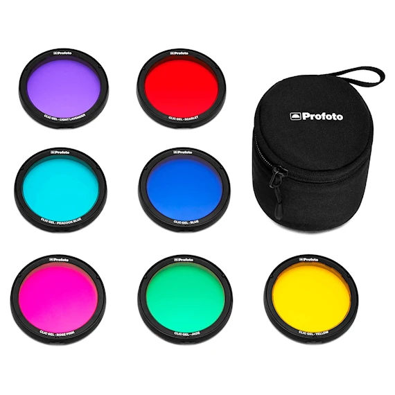 Släpp lös kreativiteten med dessa filter för din Profoto blixt. Kittet innehåller färgerna Clic Gel Jade, Clic Gel Rose Pink, Clic Gel Peacock Blue, Clic Gel Yellow, Clic Gel Blue, Clic Gel Scarlett, and Clic Gel Light Lavender