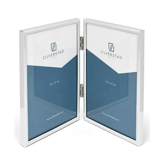 En elegant dubbelram i blank metall med plats för två bilder, sammanlänkade med gångjärn så att du själv kan vinkla bilderna precis som du vill. Ett perfekt alternativ för att rama in bilder på ett gift par, två barn eller vad helst du vill föreviga.