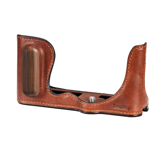 Detta halvfodral för Panasonic Lumix S9 är designat för att skydda kameran och förstärka dess vintagecharm och grepp. Tillverkat av slitstarkt och ventilerande läder med mockafodrad insida för att skydda kameran mot repor, inkluderar det ett inbyggt trägrepp och en 1/4"-20 skruv för enkel fastsättning utan verktyg. Fodralet ger obehindrad åtkomst till kamerafunktioner och har en integrerad aluminiumram som skyddar mot stötar. Ett 1/4"-20 gängat hål möjliggör stativmontering utan att ta bort fodralet.