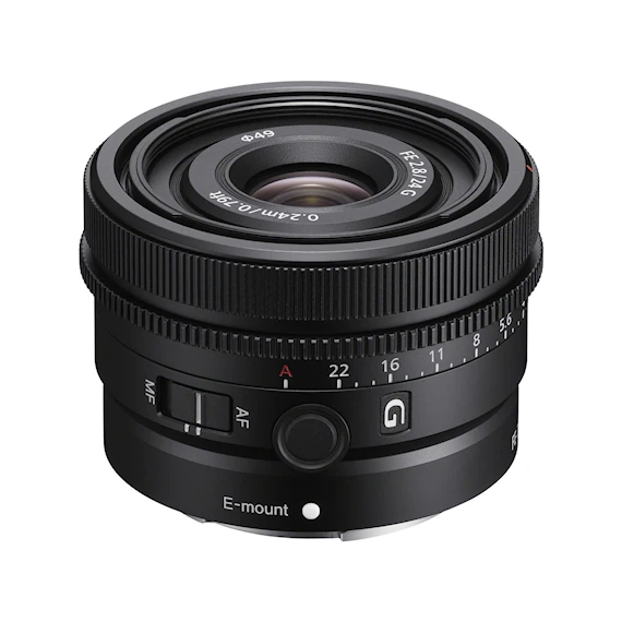 Det här är ett av Sonys fasta G-objektiv som kommer med olika brännvidd men samma utseende, med 49 mm filterdiameter, kompakt utformning och layout.