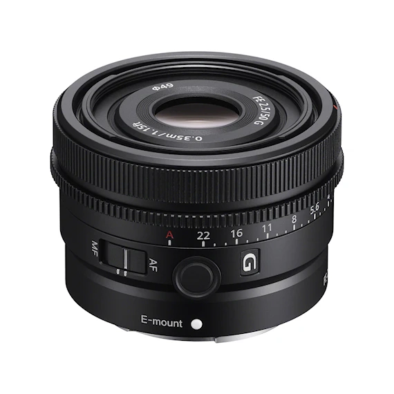Det här är ett av Sonys fasta G-objektiv som kommer med olika brännvidd men samma utseende, med 49 mm filterdiameter, kompakt utformning och layout.