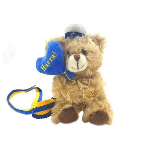 Mjuk nalle med studentmössa och med hjärtballong i handen med texten "Hurra".