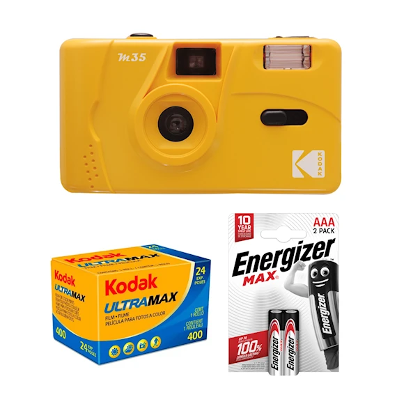 Kodak M35 är en lättanvänd kamera för att skapa autentiska fotografier. Laddas med valfri 135 film. Jämfört med engångskameror är Kodak M35 återanvändbar och därför miljövänlig. Gul variant med tillhörande UltraMax 400 + 2st AAA-batterier.